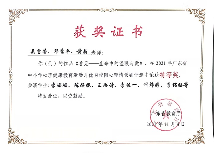 近日,廣東省教育廳公布了2021年中小學(xué)心理健康教育活動(dòng)月獲獎(jiǎng)名單。在吳雪萱、鄧秀平等老師的積極籌劃下,桂山中學(xué)作品《看見——生命中的溫暖與愛》,在廣東省優(yōu)秀校園心理情景劇的評(píng)選中榮獲特等獎(jiǎng)。
