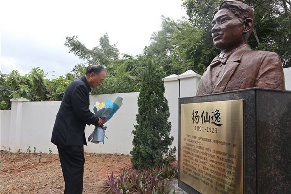 楊仙逸將軍銅像揭幕典禮上,孫必勝、程偉夫、何儉強(qiáng)、陳迪秋、劉朝暉五人共同為銅像揭幕。隨后,在場(chǎng)人員面向楊仙逸將軍銅像鞠躬致敬,瞻仰銅像,向銅像獻(xiàn)花,表達(dá)對(duì)仙逸將軍的深切緬懷和無(wú)限敬仰。學(xué)生代表上前獻(xiàn)花敬禮,向銅像許下莊嚴(yán)承諾:“繼承和弘揚(yáng)將軍精神,革新圖強(qiáng),志在沖天!”錚錚誓言慰先烈,字字千鈞擔(dān)使命。典禮后,孫必勝一行還參觀了西林山航空文化園。