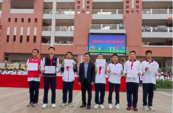 比賽結(jié)束后,吳超華主任宣布比賽結(jié)果,榮獲一等獎(jiǎng)的班級(jí)有三個(gè),二等獎(jiǎng)的班級(jí)有七個(gè),三等獎(jiǎng)的班級(jí)有五個(gè),其中初一15班榮獲特等獎(jiǎng)。校領(lǐng)導(dǎo)為班級(jí)頒發(fā)榮譽(yù)獎(jiǎng)狀并合影留念。
