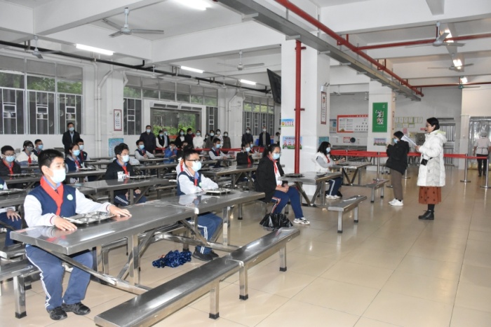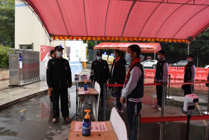 參加演練的學(xué)生首先在學(xué)校正門(mén)緩沖區(qū)排隊(duì)等待返校健康篩查,負(fù)責(zé)測(cè)溫的相關(guān)人員有序?yàn)槊恳晃粚W(xué)生檢測(cè)體溫,對(duì)體溫異常的學(xué)生及時(shí)安排復(fù)查。學(xué)生順利入校后,接著進(jìn)行了教師入校、外來(lái)人員入校兩個(gè)情況的演練。隨后,參加演練的全體人員來(lái)到學(xué)生飯?zhí)眠M(jìn)行學(xué)生就餐演練,從排隊(duì)測(cè)溫、洗手、取餐、用餐到用餐完畢,每一個(gè)環(huán)節(jié)都有序而規(guī)范?!敖淌彝话l(fā)異常情況”的演練中,參加演練的師生按照預(yù)設(shè)的流程完成了對(duì)突發(fā)情況的處理,從詢問(wèn)、判斷、疏散隔離、醫(yī)務(wù)人員介入、跟蹤處置到應(yīng)急預(yù)案啟動(dòng),整個(gè)過(guò)程緊張而有序。