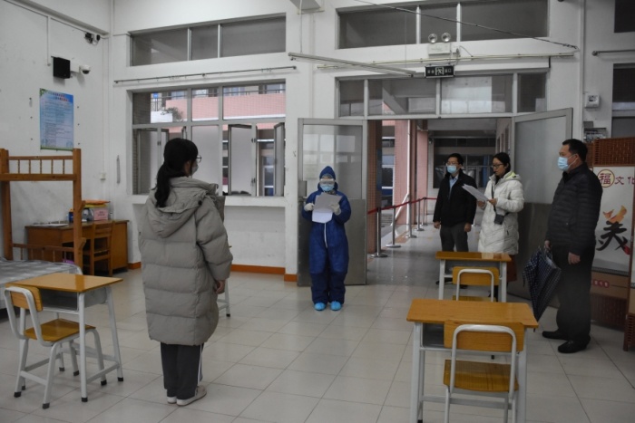 本次演練共預(yù)設(shè)了“返校入校管理”“學(xué)生就餐”“教室突發(fā)異常情況”“隔離室復(fù)查、轉(zhuǎn)運(yùn)及跟蹤處置”“學(xué)校疫情防控領(lǐng)導(dǎo)小組啟動(dòng)應(yīng)急預(yù)案”等場(chǎng)景,通過(guò)現(xiàn)場(chǎng)情景演示,結(jié)合旁白解說(shuō)的方式,將校園疫情防控工作的每一個(gè)關(guān)鍵節(jié)點(diǎn)形象真實(shí)地演練出來(lái)。下午4點(diǎn),2021年疫情防控應(yīng)急演練正式開(kāi)始,演練按照預(yù)設(shè)流程依次進(jìn)行。其中,“返校入校管理”在學(xué)校正門(mén)口進(jìn)行,“學(xué)生就餐”在學(xué)校飯?zhí)眠M(jìn)行,“教室突發(fā)異常情況”在教室進(jìn)行,“隔離室復(fù)查、轉(zhuǎn)運(yùn)及跟蹤處置”在校醫(yī)室進(jìn)行。
