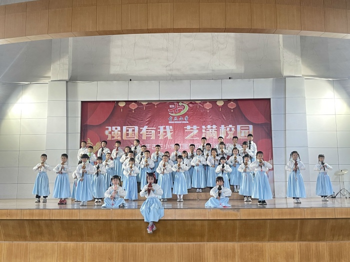 比賽按照抽簽順序登臺表演。舞臺上,小演奏家們個個衣著整齊靚麗,精神飽滿,各班級用領奏、齊奏、合奏等各種方法,同時巧妙編排隊形,配合以輕盈優(yōu)美的舞蹈,展現(xiàn)了同學們對藝術(shù)的喜愛。絲竹聲聲,童心飛揚!同學們滿懷激情,舉手投足間散發(fā)著自信、堅定和執(zhí)著。他們吹奏整齊,吹出的樂音圓潤柔美,令人陶醉。吹奏的曲目《金孔雀輕輕跳》讓人禁不住跟著輕輕躍動,《龍的傳人》宏偉大氣,《大長今》悠揚婉轉(zhuǎn),孩子們紛紛化身為“音樂小精靈”,給大家?guī)硪粓雒烂畹囊暵犑⒀纾?/p>