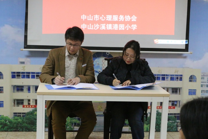 該項目得到中山市教育和體育局、沙溪鎮(zhèn)教育和體育事務中心及各方的高度關注。市教育和體育局教研員梁劍玲老師、沙溪鎮(zhèn)教體中心寧云志主任、市心理服務協(xié)會秘書長葉紅梅院長及沙溪鎮(zhèn)中小學心理教師等領導嘉賓參加了基地啟動揭幕式。港園小學代表李大良校長與中山市心理服務協(xié)會代表葉紅梅院長簽署了共建合約。