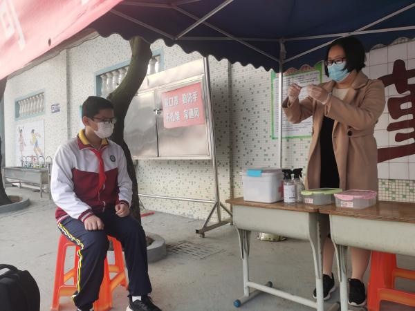 學校大門是校園疫情防控的第一道防線,把好校園第一道關卡至關重要。演練從模擬學生排隊等候進入校園開始,學生分兩個通道進入校門,經用體溫測量儀檢測學生體溫后,體溫正常者有序進入校園。當發(fā)現(xiàn)學生體溫異常時,迅速用水銀溫度計進行復測,如果體溫依舊異常,送至隔離室,上報行政并進行信息登記并聯(lián)系衛(wèi)生部門作進一步處理。