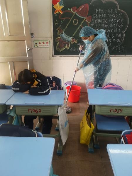 課室是學生主要的活動場所,演練第二階段,模擬任課教師上課期間,在教室里發(fā)現(xiàn)一學生萎靡不振,咳嗽,渾身發(fā)冷并伴有流感樣癥狀,馬上安排孩子與其他學生保持安全距離。將學生帶到校內隔離點,并通知相關負責領導。同時,班主任重點對教室進行消殺。