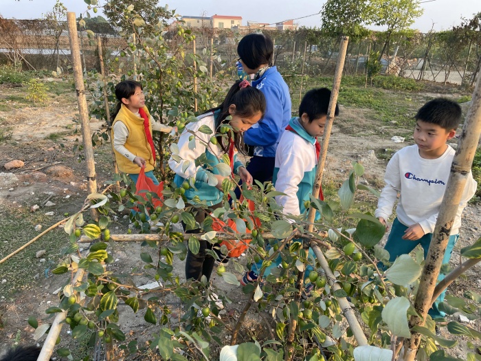 活動前,詹前秒校長和各班班主任向每位同學(xué)講述如何清理雜草、如何辨別青棗的成熟程度、如何根據(jù)成熟度來進(jìn)行正確的采摘,以及勞動過程中的注意事項,并且進(jìn)行了示范。認(rèn)真聽完老師指導(dǎo)并且完成了除草任務(wù)的同學(xué)們小心翼翼走進(jìn)青棗地里仔細(xì)觀察、尋找、挑選、詢問、研究……最后再小心采摘。就像一群勤勞的小蜜蜂,采自然地 “花”,釀“知識”的蜜。第一次嘗試從播種到豐收,孩子們興奮不已,每張小臉上都掛著驕傲與喜悅。