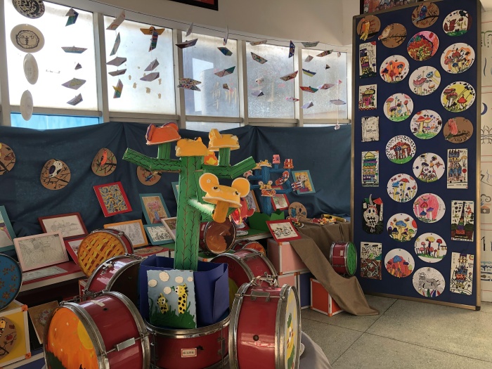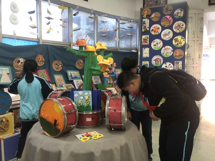 除此之外,安阜小學(xué)本次元旦畫展的一大亮點是傳達了環(huán)保的理念:學(xué)校美術(shù)興趣小組的同學(xué)們在老師的帶領(lǐng)下把鼓號隊置換下來的舊小鼓變成了畫布,創(chuàng)作了一系列鼓面裝飾畫。為畫展增添了活潑的色彩。