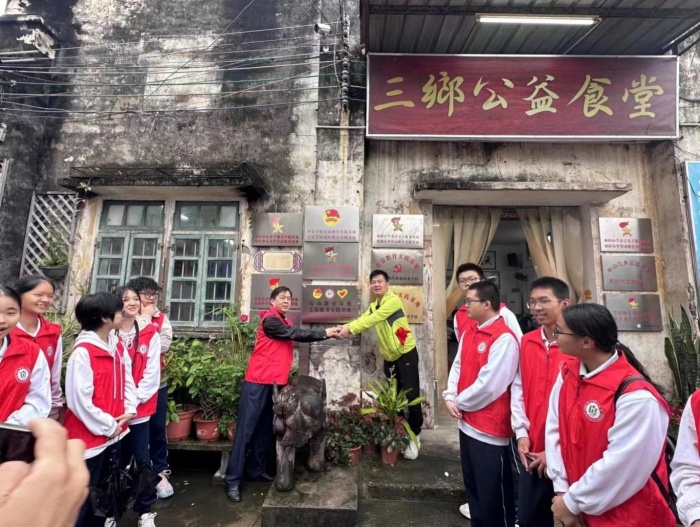為傳承敬老愛老、服務(wù)社會的美德,2023年4月1日早晨,桂山中學(xué)高一年級學(xué)生、家長身穿志愿服,冒著朦朧細(xì)雨,早早來到了三鄉(xiāng)公益食堂開展“服務(wù)老人,幫助廚師”的熱心公益活動。當(dāng)天,三鄉(xiāng)公益食堂還舉行了桂山中學(xué)志愿服務(wù)實(shí)踐基地授牌儀式。