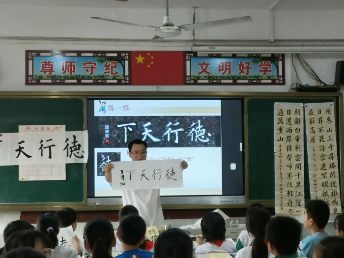 接著是馮高佳老師獻上四年級書法課《雙人旁》。馮老師以故事導(dǎo)入,引導(dǎo)學生仔細觀察,學生了解了雙人旁的寫法以及在結(jié)字中的運用,通過一步步練習,學生把“德”字寫得結(jié)構(gòu)勻稱、端正整潔。最后馮老師把課堂延伸到社會主義核心價值觀就是一種“德”,讓學生明白了學習書法就是修身養(yǎng)性,踐行“社會主義核心價值觀”。由于條件有限,高厝寮小學的學生基本都是第一次接觸書法,但短短的一節(jié)課下來,學生的作品完成度出乎意料,贏得了在場所有老師的贊美。馮老師的這節(jié)書法課對學生來說既是甘霖雨露,更是學習書法路上的一顆啟蒙種子!
