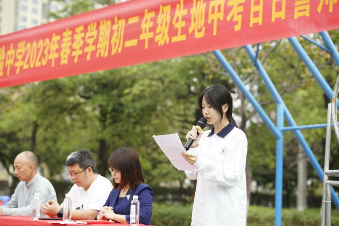 學(xué)生代表鄧玉彤同學(xué)認為備戰(zhàn)生地中考的關(guān)鍵在于樹立目標,堅定信心,努力奮斗和及時改進學(xué)習(xí)方法。她堅信初二學(xué)子必能以高昂的斗志、百倍的信心、扎實的基礎(chǔ),逐鹿考場,笑傲六月。