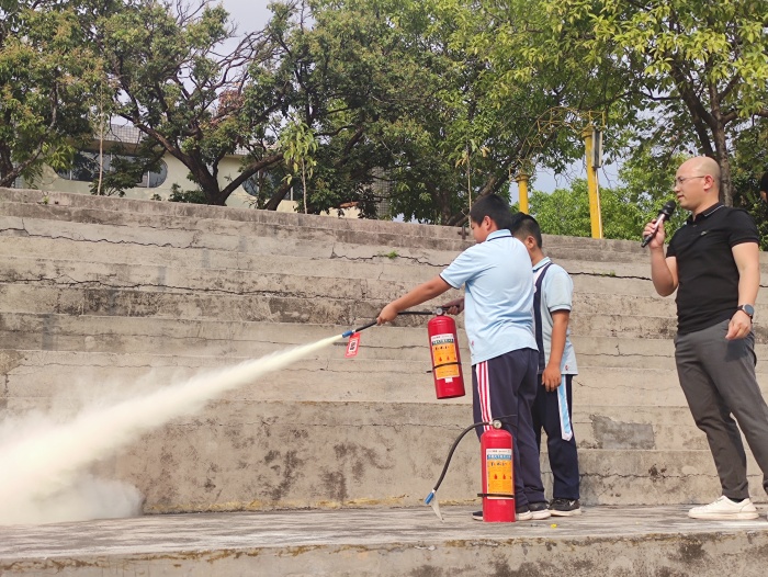 消防安全逃生后,全校師生集結(jié)于國(guó)旗下。李耀康老師對(duì)本次演練活動(dòng)作出總結(jié),對(duì)同學(xué)們能有序、安靜、快速撤離逃生給予贊揚(yáng),并再次向同學(xué)們講解消防安全知識(shí),希望全體同學(xué)牢記安全知識(shí),在遇到突發(fā)緊急情況時(shí)能冷靜安全地逃生。黃孔佳主任向全校師生講解滅火器的使用方法和注意事項(xiàng),并現(xiàn)場(chǎng)演示滅火器的正確使用。通過(guò)本次觀摩,全體學(xué)生掌握了滅火器的使用方法和技巧,在遇到突發(fā)的一般火情時(shí)能夠做到正確冷靜處理。