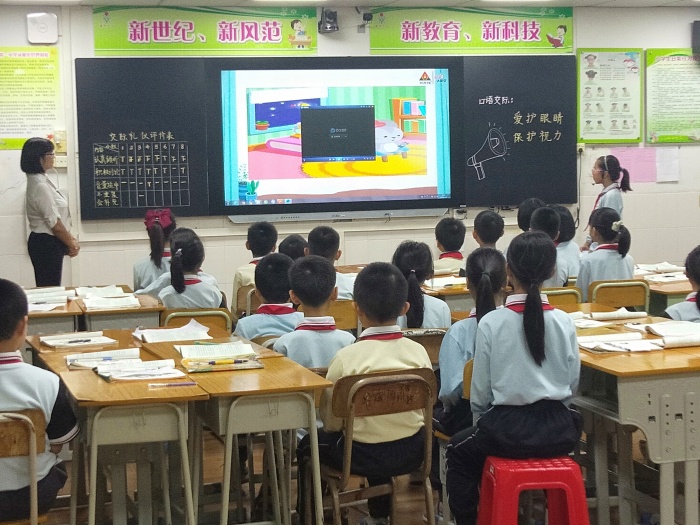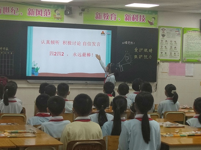 在課堂上,陳老師教態(tài)自然大方,通過目標(biāo)導(dǎo)向,讓學(xué)生明確學(xué)習(xí)目標(biāo)。接著通過視頻導(dǎo)入、課前調(diào)查分析、小組合作討論,小組上臺展示,課堂知識拓展等環(huán)節(jié)教學(xué)。陳老師的課堂設(shè)計有梯度,由易到難,使學(xué)生更好地接受知識。通過交際訓(xùn)練,學(xué)生能說出影響視力的原因、保護(hù)視力的措施,突出了口語交際訓(xùn)練的本色。課堂中班長擔(dān)任小老師,老師從旁指導(dǎo),師生與生生間精彩的互動交流將課堂氛圍推向高潮。