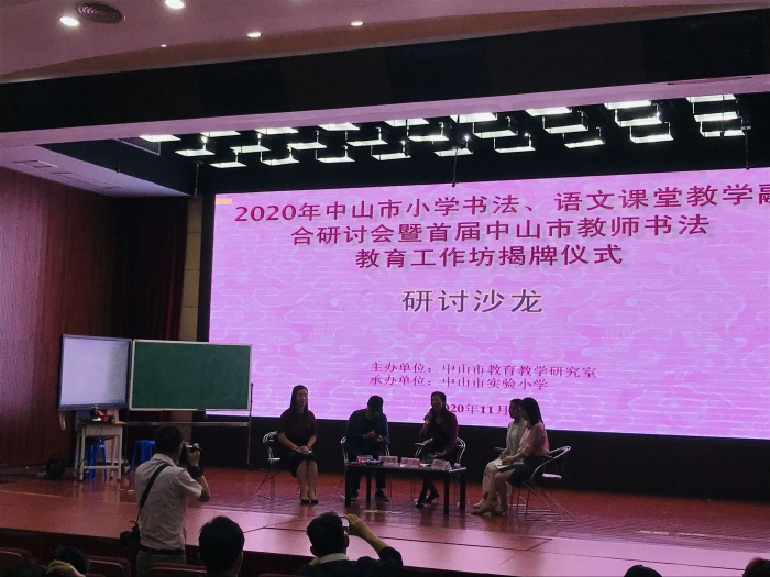 在研討沙龍環(huán)節(jié),何利老師、何寶華老師、單永輝老師以及兩位上課老師進(jìn)行了激烈的交流與討論。圍繞“語文課如何融合書法教學(xué)”“書法課該怎么上”的主題,大家各抒己見,碰撞出思維的火花,給在場的老師以深思、以提示。最后,在教研室梁雪菊老師的主持下,首屆中山市教師書法教育工作坊揭牌儀式順利完成。梁老師還為大家做了主題為“《中小學(xué)書法教育指導(dǎo)綱要》的實(shí)施與中山市書法教育教學(xué)發(fā)展構(gòu)想”的講座。