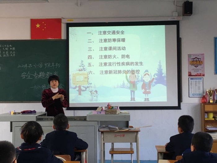 為了切實(shí)抓好學(xué)校安全防范和教育管理工作,讓學(xué)生樹立安全意識(shí),具備防范能力,近日,古一小學(xué)扎實(shí)有效地開展歲末年初安全教育和防范工作。2020年12月28日上午,六(1)班有序開展年末安全教育主題班會(huì)。本次主題班會(huì),主要從以下幾個(gè)方面講解安全知識(shí),進(jìn)一步增強(qiáng)學(xué)生的安全意識(shí)和自我保護(hù)意識(shí)的本領(lǐng):一、注意交通安全;二、注意防寒保暖;三、注意課間活動(dòng);四、注意防火、防電;五、注意流行性疾病的發(fā)生;六、注意新冠肺炎的防控。孩子們通過(guò)班會(huì)學(xué)習(xí),明白了在這特殊時(shí)期,一定要讓警鐘長(zhǎng)鳴,牢固樹立安全防范意識(shí)。