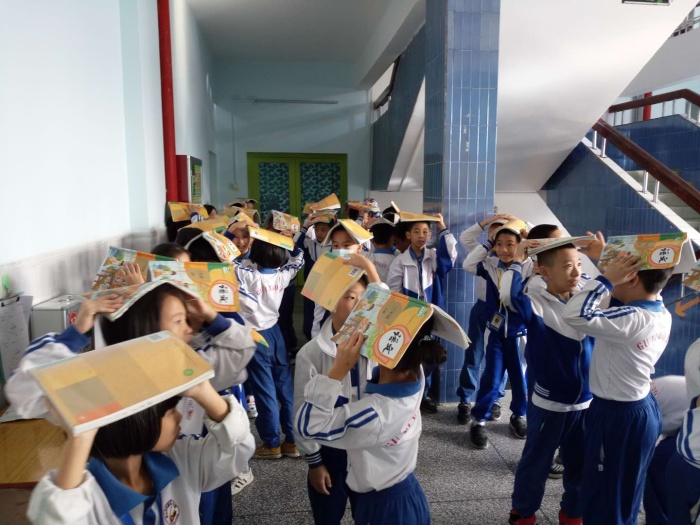第一節(jié)課下課鈴響后,警報(bào)聲響起,任課老師迅速打開教室前后門,切斷課室的所有電源,而同學(xué)們趕緊躲在班級(jí)桌椅下。當(dāng)“危險(xiǎn)”過(guò)去后,老師組織學(xué)生按照出操隊(duì)形集合并按指定路線向安全地點(diǎn)——足球場(chǎng)疏散。每個(gè)樓層的班級(jí)學(xué)生下樓的隊(duì)伍井然有序,沒有驚恐、推搡。當(dāng)各班學(xué)生到達(dá)集合地足球場(chǎng)時(shí),班長(zhǎng)清點(diǎn)人數(shù),并向總指揮報(bào)告了人數(shù)。
