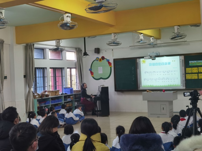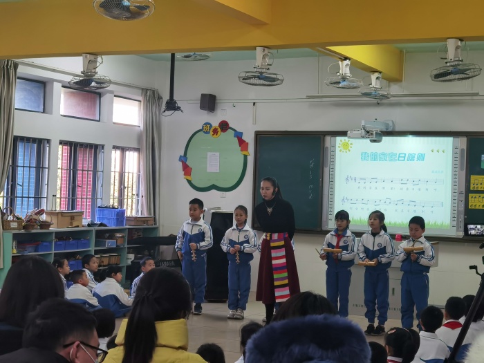 柯宜君老師執(zhí)教《我的家在日喀則》一課,課堂設(shè)計了豐富的音樂實踐活動,引導(dǎo)學(xué)生主動參與到活動中。通過聆聽、歌唱、律動、樂器伴奏等層層遞進的手法,讓學(xué)生在豐富的活動中體驗、表現(xiàn)音樂。在課堂上,柯老師以生動的語言和親切自然的教態(tài),引導(dǎo)學(xué)生在音樂活動中學(xué)習(xí)歌曲、感受二聲部、體驗合奏與律動的快樂,營造了良好的學(xué)習(xí)氛圍。課后,柯老師就本節(jié)課進行說課,介紹了教學(xué)分析、教學(xué)理念、設(shè)計思路、教學(xué)反思。在點評環(huán)節(jié),老師們充分肯定了執(zhí)教老師的教學(xué)設(shè)計水平和課堂執(zhí)教能力,同時,也給予了柯老師寶貴的意見。