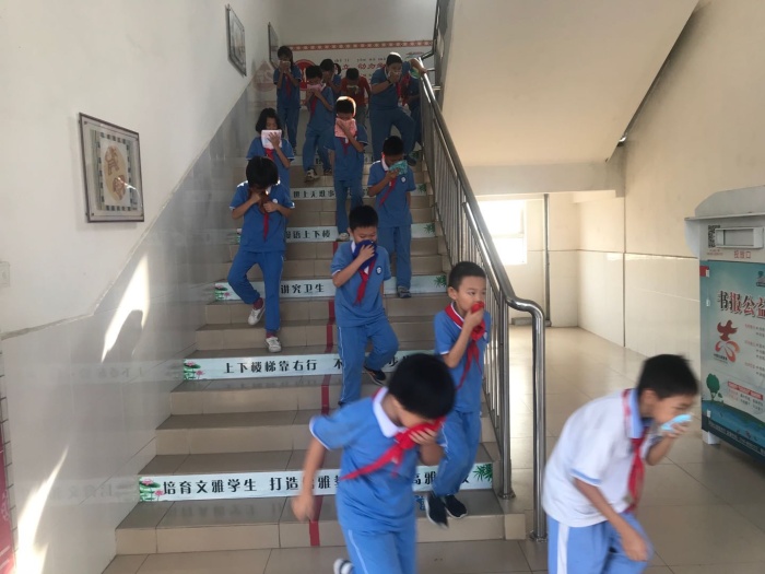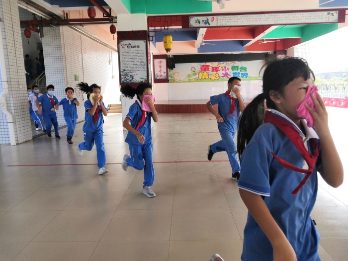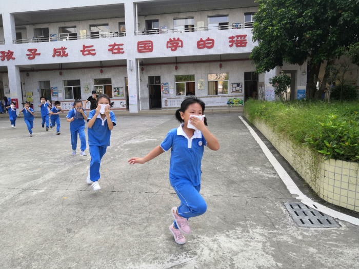上午8時(shí)40分,“嗚嗚嗚……”一陣陣急促的警報(bào)聲在校園內(nèi)響起。各班課室里正在上課的師生們立刻停下了教學(xué)和學(xué)習(xí)活動(dòng),在上課老師的組織下有序地從各班課室里疏散出來,沿著平時(shí)指定的路線奔向田徑場。警報(bào)聲響起時(shí),在思齊樓前樓三樓最西邊的三4班正在上語文課。聽到警報(bào)聲,學(xué)生們立刻在老師的指揮下,跑出課室,沿著走廊向東跑,到了三8班課室后門,再向北拐穿過連廊。連廊的盡頭是機(jī)房。同學(xué)們?cè)跈C(jī)房前再沿走廊向東拐,下樓梯,繞過一樓花圃,按照指定的路線繼續(xù)向田徑場跑去……
