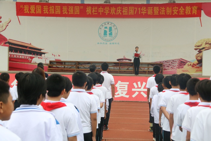 為了慶祝偉大祖國母親的生日,同時也為了能讓全體師生過一個平安、愉快的國慶小長假,9月28日,橫欄中學全體師生集中運動場,舉行了“我愛國,我報國,我強國”歡慶祖國71華誕暨法制安全教育活動。