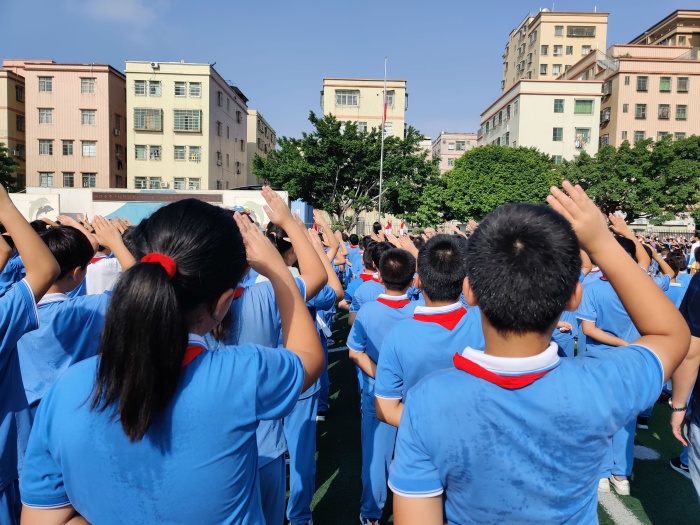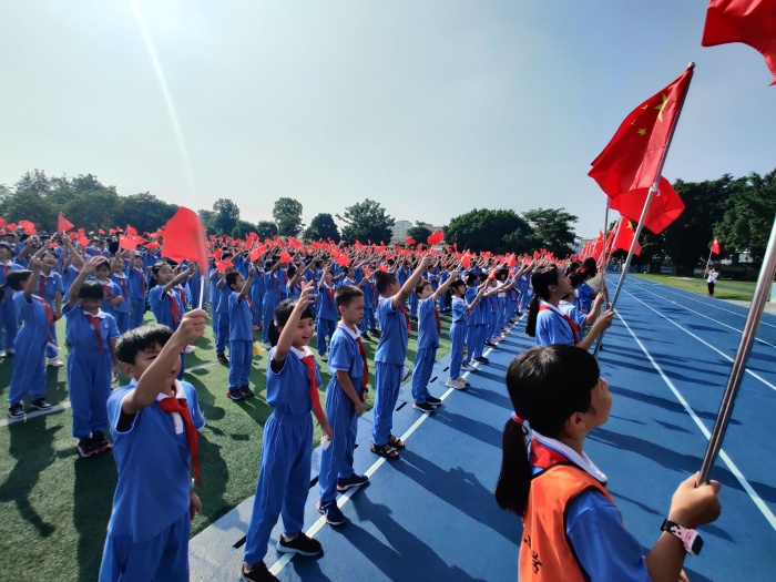 是日早晨,陽光正好,微風(fēng)不燥。四沙小學(xué)全體師生齊聚學(xué)校操場,舉行慶祝國慶節(jié)主題升旗儀式。教師和孩子們站在各自的隊伍里,望著國旗徐徐升起,同學(xué)們身姿挺拔、面迎朝陽,擲地有聲,向著國旗唱出熱愛之情,展現(xiàn)了深切濃厚的愛國熱忱和昂揚向上的青春風(fēng)貌。