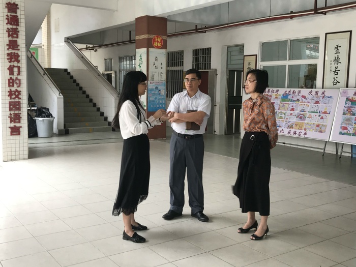 調研第二項是聽取匯報。馮紅燕校長對學校近期德育工作做了總體的匯報,同時也提出了學校所面臨的問題以及困難。黃燕芬副校長則以《以美育人》為題,圍繞學校德育工作重點和“美行”教育實際,匯報學校在師德教育、學生管理、特色社團設置等方面的做法和效果。