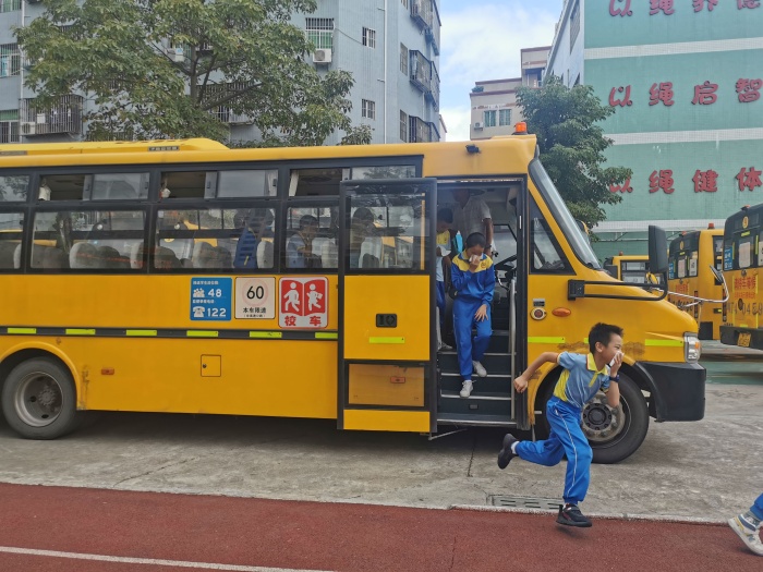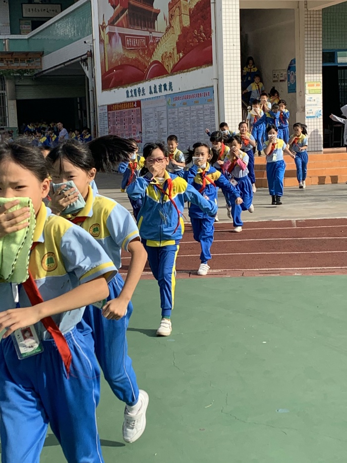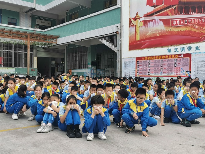 9時整,隨著一陣尖銳而又急促的火警警報聲響起,各班在班主任或科任老師指揮下,緊急進入警備狀態(tài)。孩子們迅速排好隊,從教室往樓梯口撤退。他們緊貼著墻壁或樓梯欄桿,右手用毛巾捂住口鼻,彎腰、有序、安全地向前小跑,全校師生毫不慌亂,安排人員各自盡職守護崗位,指揮并搜索有無未撤出的孩子。全校2700余師生在4分鐘之內(nèi)按預(yù)定的疏散路線安全撤離到指定地點。接著,學(xué)校還模擬了校車突發(fā)火災(zāi)后的應(yīng)急逃生演練,校車上的同學(xué)在跟車老師的指揮下安全、有序、快速地撤離到安全地方等候進一步處理。