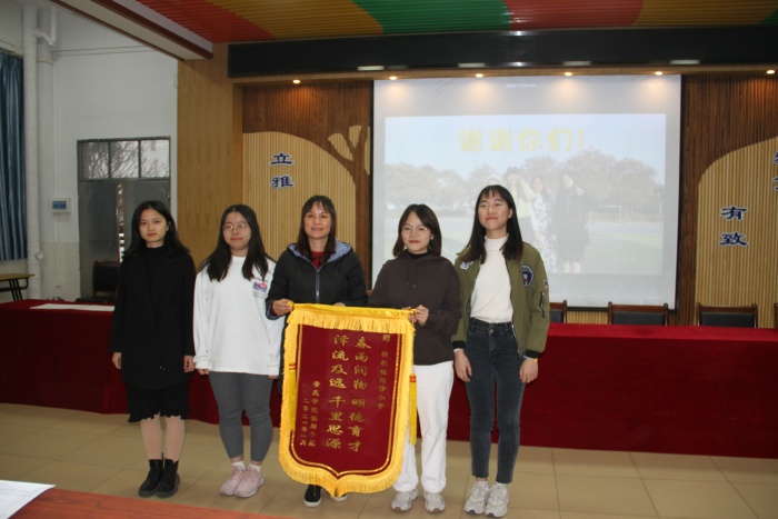 在熱烈的掌聲中,實(shí)習(xí)小組向四沙小學(xué)贈(zèng)送了上書“春雨潤物明德育才 澤流及遠(yuǎn)千里思源”錦旗。四沙小學(xué)歐慧芳校長也代表學(xué)校向她們頒發(fā)了“優(yōu)秀頂崗老師”榮譽(yù)證書,表達(dá)了學(xué)校對(duì)她們幾個(gè)月來為四沙小學(xué)所作貢獻(xiàn)的充分肯定,并祝愿她們能把在四沙小學(xué)的學(xué)習(xí)工作經(jīng)歷當(dāng)作人生旅途中的一筆財(cái)富,為日后早日踏上教書育人講壇、成為一名光榮的人民教師做準(zhǔn)備。