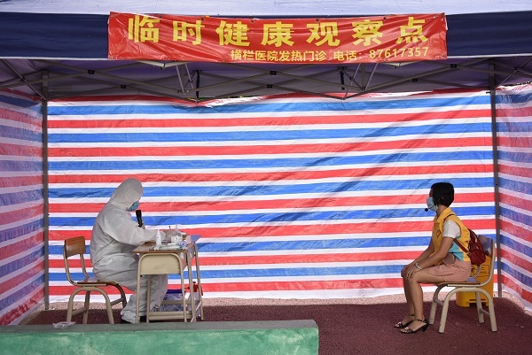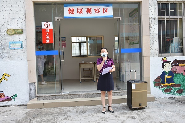 本次演練,項目包括師生正確佩戴口罩入校,校門口分流測溫,發(fā)現(xiàn)體溫異常學(xué)生的處置;課堂上發(fā)現(xiàn)學(xué)生有咳嗽、體溫超過37.3度等異?,F(xiàn)象時的應(yīng)急處置等項目。返校時,一旦發(fā)現(xiàn)學(xué)生發(fā)燒,將立刻送到健康觀察室,由保健老師進(jìn)行復(fù)檢,將情況通知家長并上報橫欄醫(yī)院和疾控中心。如果課堂上學(xué)生出現(xiàn)發(fā)燒、咳嗽等癥狀時,任課老師將嚴(yán)格依照上報流程進(jìn)行處理。最后,橫欄鎮(zhèn)第二小學(xué)衛(wèi)生副校長、橫欄醫(yī)院疾控科主任何波為本次復(fù)學(xué)演練進(jìn)行總結(jié)。何主任強(qiáng)調(diào)入校門發(fā)現(xiàn)學(xué)生體溫異常需與家長聯(lián)系,再次確認(rèn)三史情況,報告家長學(xué)生情況后撥打120送醫(yī)院;課堂發(fā)現(xiàn)學(xué)生體溫異常,帶學(xué)生出課室門口需再次進(jìn)行手消毒,加戴一次性外科口罩,保健醫(yī)生要穿隔離服;學(xué)生送醫(yī)后,觀察室需要使用紫外線嚴(yán)格消毒。