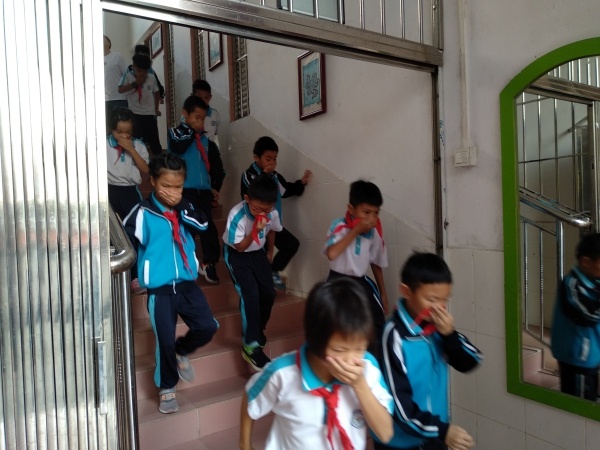 上午8:45分,學(xué)校廣播站突然響起“嗚嗚嗚……”的警報(bào)聲信號(hào)。緊接著,在教學(xué)樓里的師生們馬上彎下腰、用毛巾捂著口鼻,按低樓層到高樓層的順序,各班學(xué)生在科任教師的帶領(lǐng)下,從各個(gè)教學(xué)樓樓梯,有秩序的迅速撤離教學(xué)樓,快速、安全、有序地疏散到學(xué)校運(yùn)動(dòng)場(chǎng)。到達(dá)運(yùn)動(dòng)場(chǎng)后,各班負(fù)責(zé)人整隊(duì)、報(bào)數(shù),除了請(qǐng)假外,在規(guī)定時(shí)間內(nèi)全部到達(dá)指定安全位置。德育處湯惠儀主任對(duì)這次逃生演練進(jìn)行了小結(jié),肯定了這次演練,同時(shí)也指出了逃生演練過程中存在的問題。