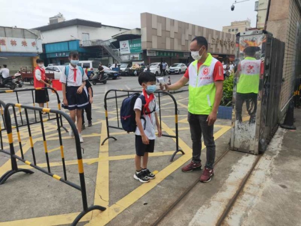 從上午七點(diǎn)開始,在學(xué)校門前,交通協(xié)管、保安、學(xué)校領(lǐng)導(dǎo)和家長義工頂風(fēng)冒雨維持入校秩序,分工合作進(jìn)行路口交通疏導(dǎo)和校門測溫。門口增設(shè)安全通道,學(xué)校貼心地在地面貼上間隔一米的標(biāo)志點(diǎn),并細(xì)心提醒孩子們保持1米安全距離。橫欄鎮(zhèn)教育事務(wù)指導(dǎo)中心教科研王春明專干也一早到三沙小學(xué)指導(dǎo)學(xué)校開學(xué)工作。