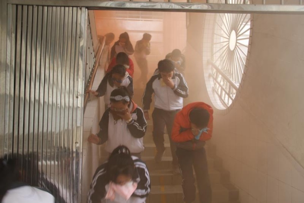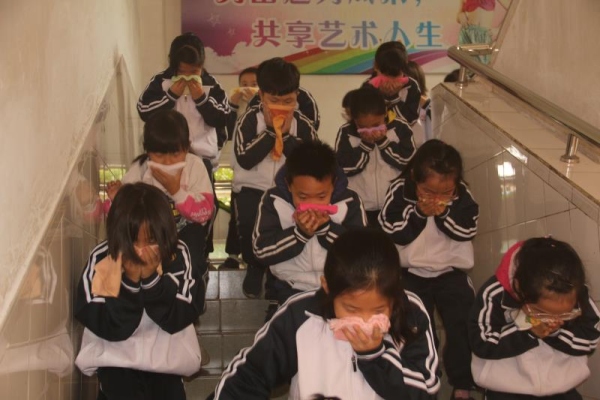 8點(diǎn)40分,安全管理員通過廣播提醒師生們演練的要求以及注意事項(xiàng)。隨后8點(diǎn)43分,教學(xué)樓二樓東面走廊冒出滾滾濃煙,“火災(zāi)”發(fā)生了!火災(zāi)警報(bào)馬上響起,提醒師生迅速撤離到足球場(chǎng)。各班上午第一節(jié)的上課老師馬上組織學(xué)生快速集合,并用毛巾捂住口鼻,按照既定疏散路線迅速有序地跑下樓梯,到達(dá)田徑場(chǎng)集中。隨后各班體育委員清點(diǎn)本班人數(shù)并向班主任匯報(bào)。