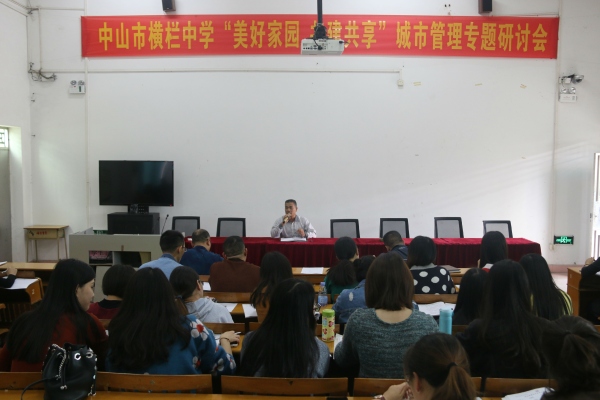 2019年12月16日下午,橫欄中學(xué)在學(xué)校階梯室以 “城市管理大家談”的形式開展了“美好校園共建共享”城市管理專題研討會。該研討會的召開,一是要積極響應(yīng)中山市及橫欄鎮(zhèn)創(chuàng)文工作領(lǐng)導(dǎo)小組辦公室的號召,二是進一步加強師生愛校意識,建設(shè)美麗校園,為營造共建共治共享的城鎮(zhèn)治理格局貢獻一份力量。此次專題研討會由橫欄中學(xué)分管德育工作的工會主席黃富榮主講。學(xué)校德育處副主任陳冬華、麥潤洪、陳倫全、全體德育級長以及全校班主任參與此次研討活動。