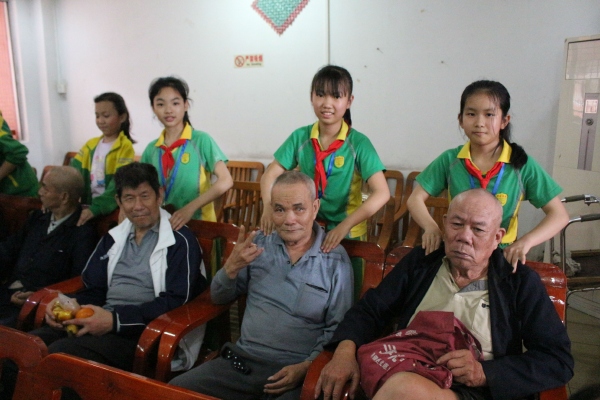 剛到橫欄福利康樂中心,在大隊輔導(dǎo)員張勇老師的安排下,同學(xué)們便立即的行動起來,分組為老人們打掃院子,擦窗戶玻璃,清理蜘蛛網(wǎng),并且滿懷熱情地走到老人的身邊,噓寒問暖,給老人們捶背等。同學(xué)們純真的表情,親切的話語,使得老人們樂不可支,其樂融融。 在敬老院里,同學(xué)們把全校同學(xué)的愛心水果、餅干、牛奶等慰問品送到每一位老人們的手中,老人們不停地贊嘆著,看著這群懂事又天真的孩子們,高興得合不攏嘴,整個敬老院里到處都洋溢著溫馨、祥和的氣氛??吹嚼先藗兡樕涎笠绲臓N爛笑容,同學(xué)們也會心地笑了,整個敬老院充滿了歡聲笑語。