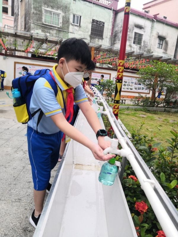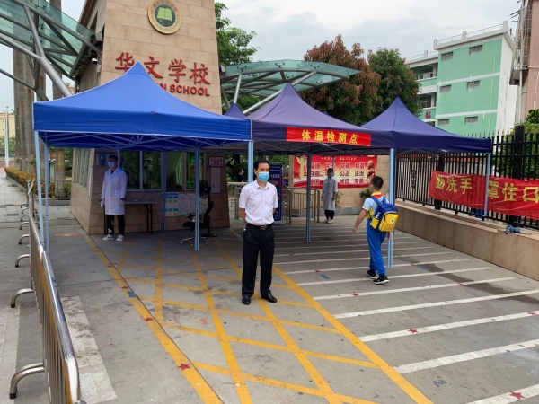今天是華文學(xué)校四——六年級學(xué)生返校復(fù)學(xué)的日子。雖然已過立夏,但偉人故里的中山依舊有些涼意,還下起了小雨,早上6點(diǎn)20分,謝春生校長就帶領(lǐng)行政、教師們在校園里巡視檢查、在校門口歡迎學(xué)生們的到來。認(rèn)真負(fù)責(zé)的體溫檢測人員、和藹可親的值日教師讓學(xué)生們樂在其中。