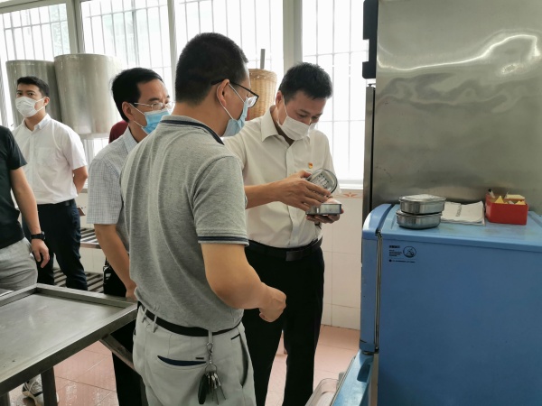 蕭華海副書(shū)記一行從臨時(shí)隔離室、師生洗手池、課室、餐廳、食堂加工區(qū)、保健室、隔離室、物資儲(chǔ)備室等地方對(duì)學(xué)校疫情防控工作和復(fù)學(xué)準(zhǔn)備工作進(jìn)行現(xiàn)場(chǎng)查看,并提出進(jìn)一步完善的意見(jiàn)和建議。蕭華海副書(shū)記在課室里查看了班級(jí)布置情況,了解學(xué)生用餐事宜;在食堂加工區(qū)檢查了留樣食物,強(qiáng)調(diào)食材要新鮮、農(nóng)產(chǎn)品的檢測(cè)要做實(shí)做細(xì);在檢查保健室、隔離室時(shí)聽(tīng)取了華文學(xué)校謝春生校長(zhǎng)關(guān)于學(xué)校應(yīng)急處置流程的匯報(bào),要求學(xué)校早發(fā)現(xiàn)、早隔離、早處理。