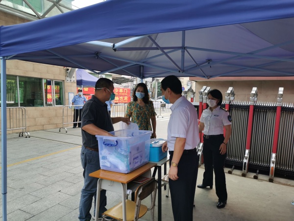 林達光一行從臨時隔離室、師生洗手池、學校餐廳、廚房、課室、器材室、保健室、隔離室等地方對學校疫情防控工作和復學準備工作進行現(xiàn)場督導檢查,并提出進一步完善的意見和建議。調(diào)研中,在二(8)班教室現(xiàn)場詢問了該班主任關(guān)于疫情應(yīng)急處理的情況,在餐廳細心檢查了廚房人員的衛(wèi)生狀況,在保健室還向?qū)W校保健醫(yī)生詢問了各種器材的使用情況。林達光肯定學校疫情防控和復學工作取得成績的同時,要求學校進一步強化對疫情嚴峻性的認識,堅決貫徹落實市鎮(zhèn)關(guān)于疫情防控工作的有關(guān)要求,將疫情防控工作抓緊抓細抓實;進一步完善疫情防控各項工作預(yù)案,確保防控工作落地落實落細,為開學后應(yīng)急處置工作做好充分準備。他強調(diào):1.學校要加強培訓,每位教師都要熟練這套應(yīng)急流程;2.各種器材要規(guī)范使用;3.開課之前,教師之間互相學習,各項工作落到實處,齊心協(xié)力,打贏防疫攻堅戰(zhàn)。