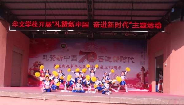 為隆重慶祝中華人民共和國(guó)成立七十周年,唱響禮贊新中國(guó)、奮進(jìn)新時(shí)代主旋律,激發(fā)師生愛國(guó)熱情,引導(dǎo)師生共同書寫建設(shè)祖國(guó)新篇章,根據(jù)上級(jí)有關(guān)精神,結(jié)合學(xué)校實(shí)際,在華文學(xué)校德育處的組織下,于9月30日上午八時(shí)開展“禮贊新中國(guó),奮進(jìn)新時(shí)代”新中國(guó)七十華誕慶祝活動(dòng)。本次活動(dòng)由荀丹老師主持。