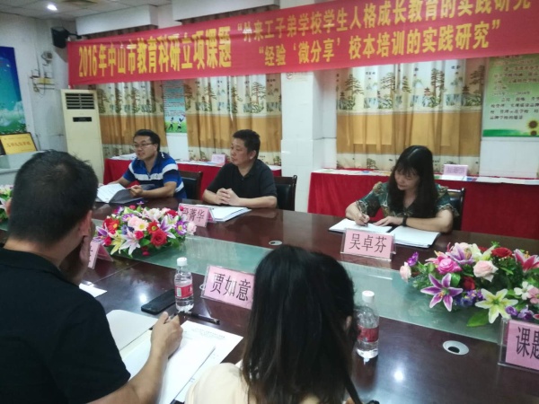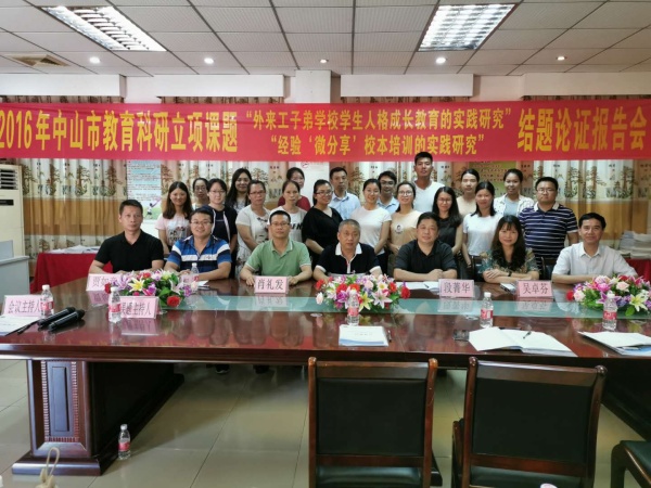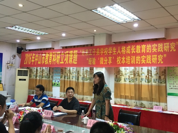 質(zhì)量立校,科研興校。教科研作為學(xué)校工作的重要內(nèi)容之一,是促進(jìn)教師專(zhuān)業(yè)化發(fā)展的有效途徑,也是學(xué)校持久發(fā)展的不竭動(dòng)力。為了進(jìn)一步提升學(xué)校辦學(xué)品質(zhì),逐步實(shí)現(xiàn)以課題研究引領(lǐng)學(xué)校教育教學(xué)工作的開(kāi)展,中山市橫欄華文學(xué)校近日在會(huì)議室舉行了中山市2016年教育科研立項(xiàng)課題規(guī)劃項(xiàng)目“外來(lái)工子弟學(xué)校學(xué)生人格成長(zhǎng)教育的實(shí)踐研究”和中山市2016年教育科研立項(xiàng)課題青年項(xiàng)目“經(jīng)驗(yàn)‘微分享'校本培訓(xùn)的實(shí)踐研究”結(jié)題鑒定報(bào)告會(huì)。中山市教育教學(xué)研究室副主任段菁華先生、中山市教育教學(xué)研究室教研員郭躍輝先生、橫欄鎮(zhèn)教育事務(wù)指導(dǎo)中心副主任吳卓芬女士、華文學(xué)校董事祝和群先生、華文學(xué)校校長(zhǎng)謝春生先生及華文全體課題組成員出席了此次會(huì)議,會(huì)議由課題組成員李永海副主任主持。