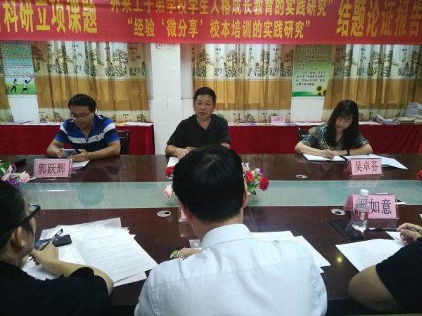 然后,專(zhuān)家組對(duì)本課題的結(jié)題成果及其他資料進(jìn)行了查閱。專(zhuān)家組充分肯定了華文學(xué)校對(duì)科研工作的重視、課題組研究的熱情以及課題的研究?jī)r(jià)值,同時(shí)建議課題組在今后的研究過(guò)程中,要加強(qiáng)學(xué)習(xí)、交流與總結(jié)提煉,進(jìn)一步細(xì)化目標(biāo)、操作和評(píng)價(jià)體系,要讓研究工作有機(jī)融合,要注重平日研究原始資料的積累,特別是要用于實(shí)踐。段菁華主任除了充分肯定學(xué)校的課題工作之外,還特別提出學(xué)校課題工作過(guò)程扎實(shí)、成果豐實(shí);也對(duì)今后的工作做了兩點(diǎn)建議:成果要更側(cè)重于學(xué)生;創(chuàng)新性的手段要更加多樣化。他強(qiáng)調(diào):這不僅僅當(dāng)作是課題,也應(yīng)當(dāng)作民辦學(xué)校教科研的探路者、引領(lǐng)者。宣讀本次結(jié)題鑒定結(jié)果的是郭躍輝老師,郭老師從課題研究針對(duì)性強(qiáng)、思路清晰、研究成果豐富且效果顯著三個(gè)方面進(jìn)行點(diǎn)評(píng),并準(zhǔn)予結(jié)題。吳卓芬副主任對(duì)于學(xué)?!傲⒌聵?shù)人、德育為先”的育人理念表示肯定。她首先感謝及期盼市教研室專(zhuān)家對(duì)橫欄鎮(zhèn)及華文學(xué)校的教科研給予更多支持和關(guān)懷,希望華文學(xué)校再接再厲,在教研室專(zhuān)家們的引領(lǐng)下,把專(zhuān)家們的意見(jiàn)作為指引,打造一支高素質(zhì)的教師隊(duì)伍,形成濃厚的教科研氛圍,為全鎮(zhèn)教科研做好領(lǐng)頭羊,并以此為起點(diǎn),在在今后的課題研究方面獲得更加豐碩的成果。隨后,謝校長(zhǎng)對(duì)專(zhuān)家組在百忙之中抽空蒞臨華文學(xué)校指導(dǎo)學(xué)校教科研工作表示誠(chéng)摯的感謝;也概括了教科研對(duì)教師的成長(zhǎng)、學(xué)校的發(fā)展所起的重要作用;強(qiáng)調(diào)教科研同樣還是學(xué)校的軟實(shí)力的一個(gè)標(biāo)簽,也提升了學(xué)校的辦學(xué)知名度;并希望全體課題組成員再接再厲,引領(lǐng)學(xué)校教師形成人人有課題、人人齊參與的濃厚的教研研氛圍,進(jìn)一步提高全體教師的專(zhuān)業(yè)水平。