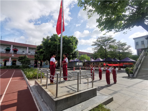 全體師生莊嚴肅穆面向國旗,國歌聲響徹校園,一只只舉起的小手,都是對祖國一份份的敬意,身為新時代的祖國花朵,應努力學習,奮發(fā)向上,為建設祖國出一份力。