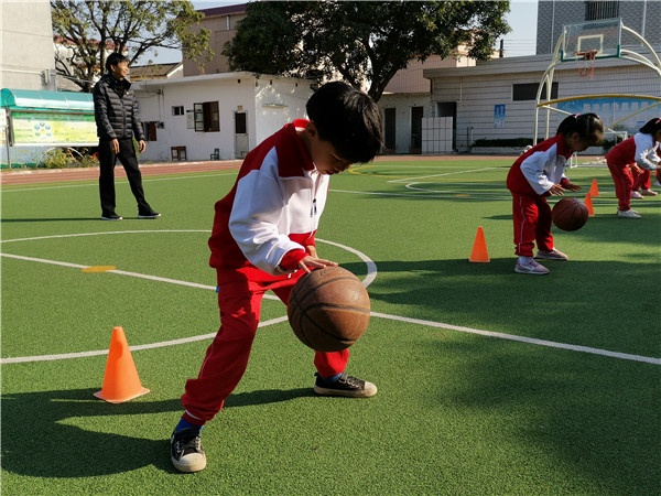 拍球比賽。一二年級的學(xué)生別看他們幼小,模樣看起來卻是有范。他們一邊拍球,一邊為自己打氣,盡管中途球被“打偏”了,但立馬就撿起來繼續(xù)拍打,認真比賽的樣子甚是可愛。