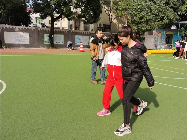 活動(dòng)在梁蔚菁校長講話后進(jìn)行,首先是“搭橋過河”,學(xué)生在前面走,而家長在學(xué)生身后為他們“搭橋鋪路”,就像成長過程中家長總是在孩子們身后默默地為他們搭建起人生的橋梁。在歡聲笑語中,同學(xué)們感受到家長無私而偉大的愛。