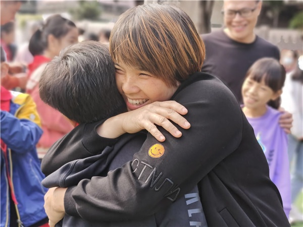 最后是親子互換體驗(yàn)“你是我的眼”,在成長過程中,總是父母牽引著孩子們前進(jìn),如今學(xué)生與家長角色對(duì)調(diào),家長蒙著眼睛被孩子牽引著,一步一個(gè)腳印地前進(jìn),跨越前方的障礙,這都需要孩子與父母之間的相互信任。最后到達(dá)終點(diǎn)的擁抱,更是讓學(xué)生與家長感受到彼此之間的愛。