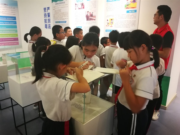 走進(jìn)心知灣禁毒社工服務(wù)中心,禁毒辦工作人員首先對(duì)石岐區(qū)康復(fù)工作站的工作內(nèi)容、開(kāi)展的相關(guān)活動(dòng),及工作站“七類四級(jí)”管控模式進(jìn)行了簡(jiǎn)單的介紹。接著,又帶著大家參觀了康復(fù)工作站的書(shū)畫(huà)室。書(shū)畫(huà)室中,有書(shū)畫(huà)老師、戒毒者,以及慕名前來(lái)學(xué)習(xí)的小朋友們的精美作品;看到這些書(shū)畫(huà),家長(zhǎng)和師生們紛紛贊嘆,真沒(méi)想到在康復(fù)工作站居然還有如此高尚雅致之地!緊接著,禁毒辦工作人員又帶領(lǐng)大家參觀了中山市石岐區(qū)毒品教育基地。在教育基地中,禁毒辦工作人員對(duì)新型毒品種類、特點(diǎn)、危害進(jìn)行了詳細(xì)的講解,同學(xué)們邊聽(tīng)邊認(rèn)真地做著筆記。同學(xué)們通過(guò)對(duì)毒品的近距離觀察,不時(shí)發(fā)出一聲聲驚嘆。當(dāng)大家走進(jìn)中山禁毒時(shí)光屋,看到各種自己愛(ài)吃的跳跳糖、棒棒糖、咖啡等成了毒品,一個(gè)個(gè)都很吃驚,表示以后不敢再吃這些東西了。禁毒專干告訴他們,這些并不是他們愛(ài)吃的東西,而是不法分子把新型毒品進(jìn)行改裝,引誘他們吸毒,所以以后要加強(qiáng)警惕,陌生人給的食物不要隨便接受,以免上當(dāng)。