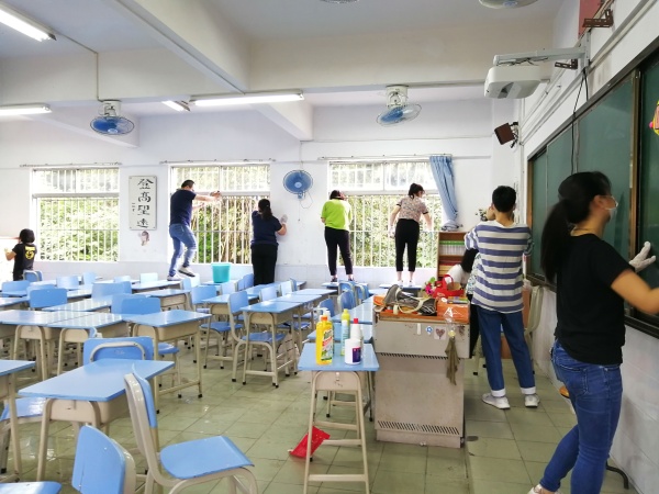 近80名班主任和副班主任認(rèn)真負(fù)責(zé),與家委會(huì)成員通力協(xié)作,利用“五一”勞動(dòng)節(jié)假期清掃課室,為保障孩子們學(xué)習(xí)的地方干凈、衛(wèi)生、整潔做好了前期的準(zhǔn)備。老師和家長(zhǎng)們從地面、課桌、風(fēng)扇、窗戶、窗簾、墻壁、走廊到樓道,每個(gè)角落逐一清掃消毒,大家盡心盡責(zé)。