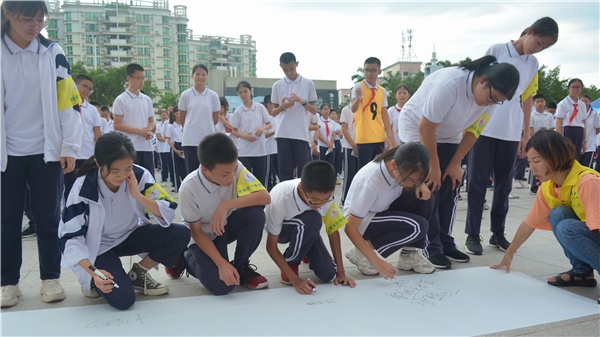 “我是中華民族的兒女,不忘恥辱,堅(jiān)決與毒魔作斗爭,珍愛生命,拒絕毒品,保證不吸毒、不制毒、不種毒、不販毒,積極檢舉販毒行為,自覺抵御毒品的侵蝕,積極投身于禁毒斗爭行列,我將履行禁毒誓言,為國家禁毒事業(yè)作出自己應(yīng)有的貢獻(xiàn)”。錚錚誓言在校園內(nèi)久久回蕩,直上云霄。在場同學(xué)鄭重宣誓后,各班學(xué)生代表上臺(tái)簽名并書寫自己醞釀出來的禁毒標(biāo)語。