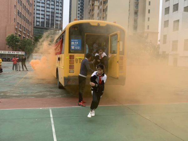 全體師生集合后,俞希金老師從校車危險產(chǎn)生的原因和危害性講解了校車安全應(yīng)急逃生演練的重要性和必要性。并就應(yīng)對校車突發(fā)事故的逃生知識、方法和實際操作要領(lǐng)做了講解。并進行校車突發(fā)事故逃生演練:演練校車在行駛過程中突然起火,車內(nèi)、車外濃煙滾滾,校車駕駛員熄滅油門,打開車門,跟車教師組織車上的學生捂住口鼻,有序跑向安全地帶,成功疏散集中后,由跟車教師清點人數(shù)。