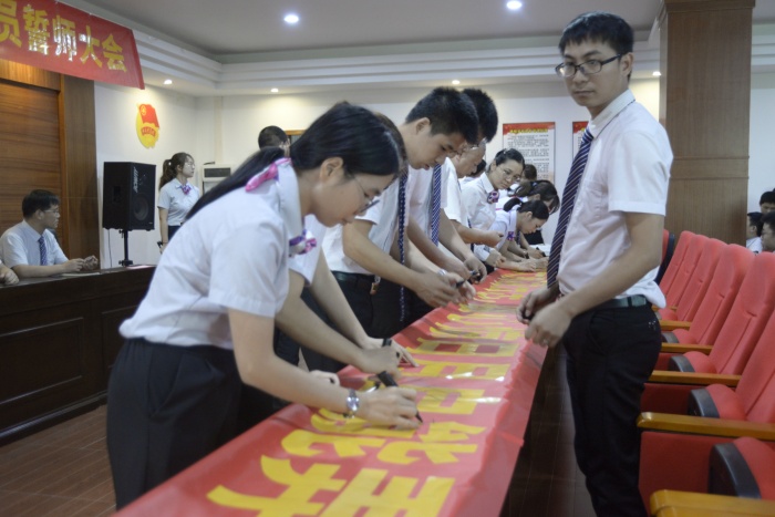 之后,初三年級組長王景付老師帶領(lǐng)全體初三教師發(fā)出了錚錚誓言:定會做學(xué)生強(qiáng)有力的后盾,與學(xué)生同甘共苦,為德恒學(xué)子保駕護(hù)航。緊隨其后,全體初三學(xué)生也莊嚴(yán)宣誓:目標(biāo)明確,積極向上;勤學(xué)苦練,斗志昂揚(yáng);講究方法,保質(zhì)保量;頑強(qiáng)拼搏,不棄不放;爭分奪秒,適度緊張;全力以赴,創(chuàng)造輝煌!鏗鏘的誓言如春雷陣陣響徹云霄,燃起了孩子們的斗志,堅(jiān)定了他們必勝的信心。最后,全體師生在橫幅上中簽名以表決心。至此,本次誓師大會圓滿結(jié)束。