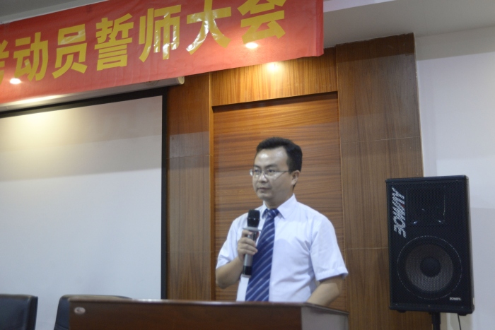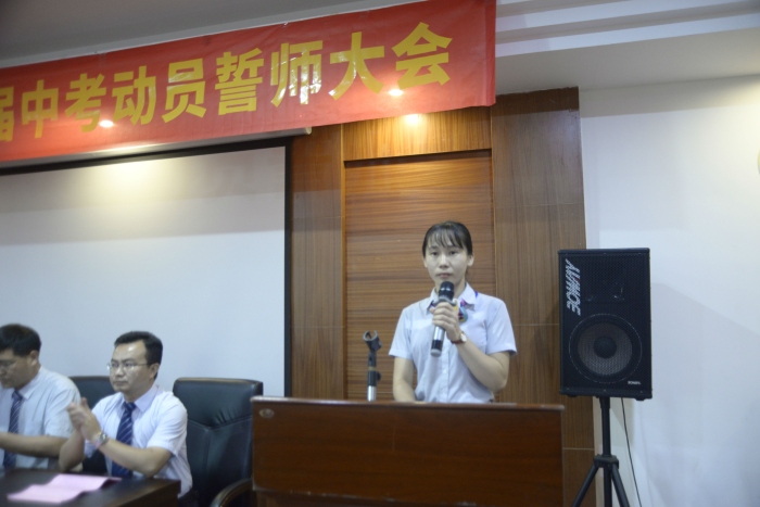 全體初三學(xué)子伴隨著激昂的旋律陸續(xù)入場,誓師大會在莊嚴(yán)的國歌聲中拉開序幕。初三教師代表陳園老師率先發(fā)言,她諄諄教誨,對全體學(xué)生在提出了詳細(xì)的要求,要求同學(xué)們樹立必勝的信心,制定學(xué)習(xí)計(jì)劃,珍惜時(shí)間,調(diào)整心態(tài),以堅(jiān)強(qiáng)的意志迎戰(zhàn)中考。
