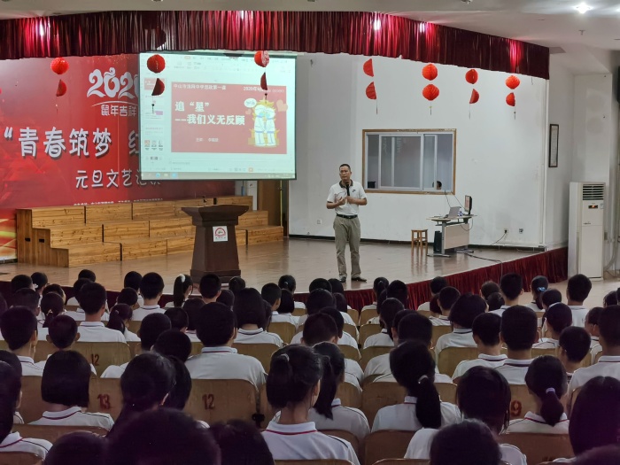 2020年9月30日下午,浪網(wǎng)中學“思政第一課”開講了。李錫堂校長在階梯禮堂給全體師生上了一節(jié)以“追‘星',我們義無反顧”為題目的“思政第一課”。