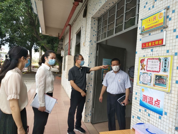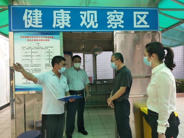 5月9日上午,民眾鎮(zhèn)黨委副書記、鎮(zhèn)長黃聲群、黨委委員劉釗妍、衛(wèi)健局、市場監(jiān)管局、社區(qū)衛(wèi)生服務(wù)中心、疾控中心及教育事務(wù)指導(dǎo)中心黃海文主任、田萊莉副主任等組成學(xué)生返校疫情防控專班來到民眾中心小學(xué),對學(xué)生返校疫情防控準(zhǔn)備工作進(jìn)行驗收。在民眾中心小學(xué)全體行政陪同下,黃聲群鎮(zhèn)長一行分成兩組,分別對民眾中心小學(xué)的疫情防控工作進(jìn)行了實地考察和防疫準(zhǔn)備工作資料查閱,了解學(xué)校各項防疫工作是否按照中山市學(xué)生返校專班62項要求落實學(xué)生返校復(fù)學(xué)準(zhǔn)備工作。之后,專班成員針對各項要求對本次驗收工作進(jìn)行反饋,并提出相關(guān)的整改建議,要求學(xué)校盡快落實整改,并做好相關(guān)的資料上報。
